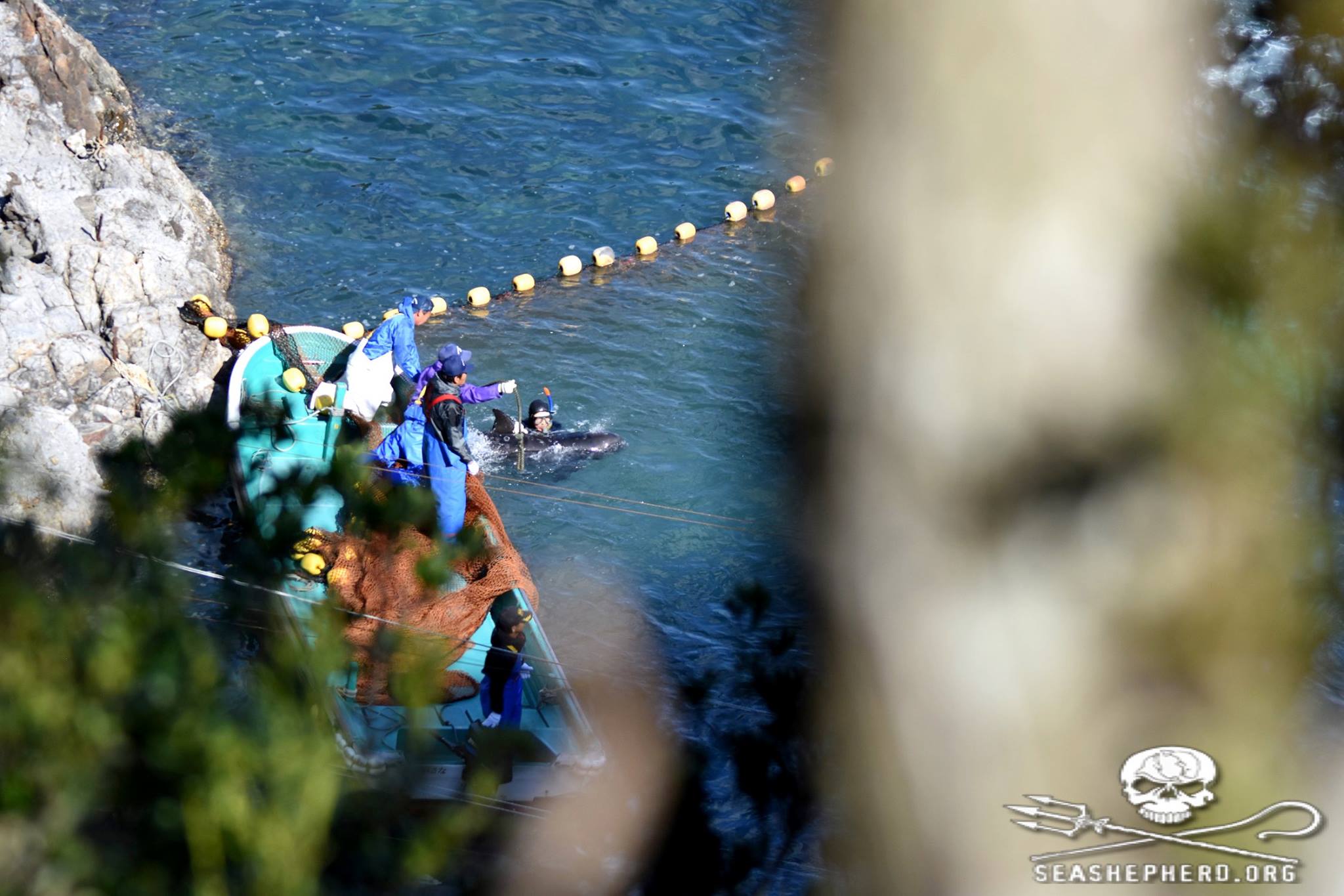 Ein geschwächter im Netz verhedderter, ertrinkender Delfin (im Video zu sehen) wurde kurzerhand durch einen Taucher unter die Tötung Planen gezwungen, wo die restlichen Mörder warteten, um die Schule von vier Grampus griseus abzuschlachten und zu zerstören. Die gesamte Delfinfamilie wurde brutal misshandelt und abgeschlachtet, es gab keinen überlebenden.