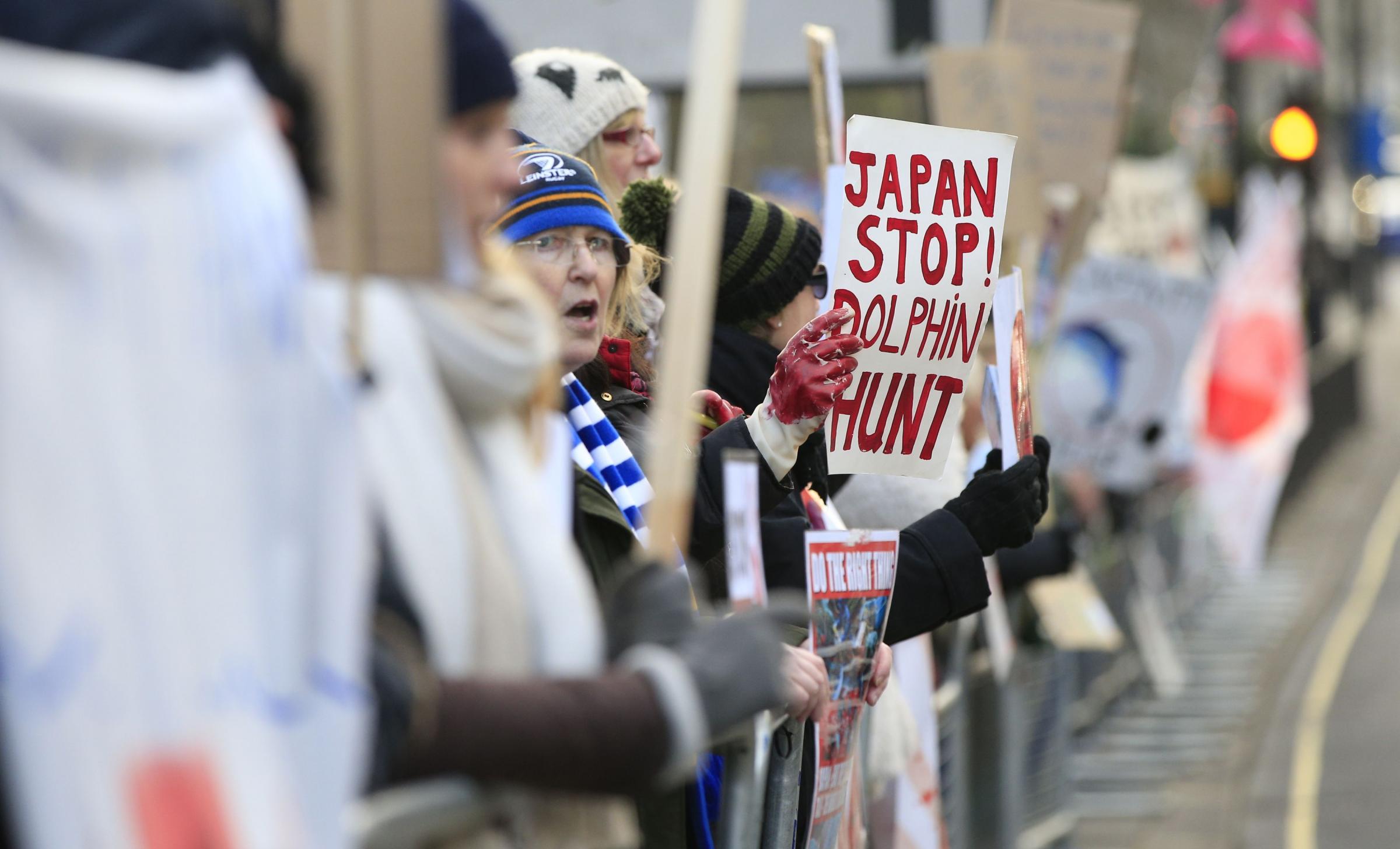 Die Demonstranten und Aktivisten forderten ein Ende der brutalen Jagdpraktiken des Fischerdorfes Taiji in Japan, wo Delphine und Kleinwale mit äussester Brutalität misshandelt, entführt für Delfinarien und abgeschlachtet werden.