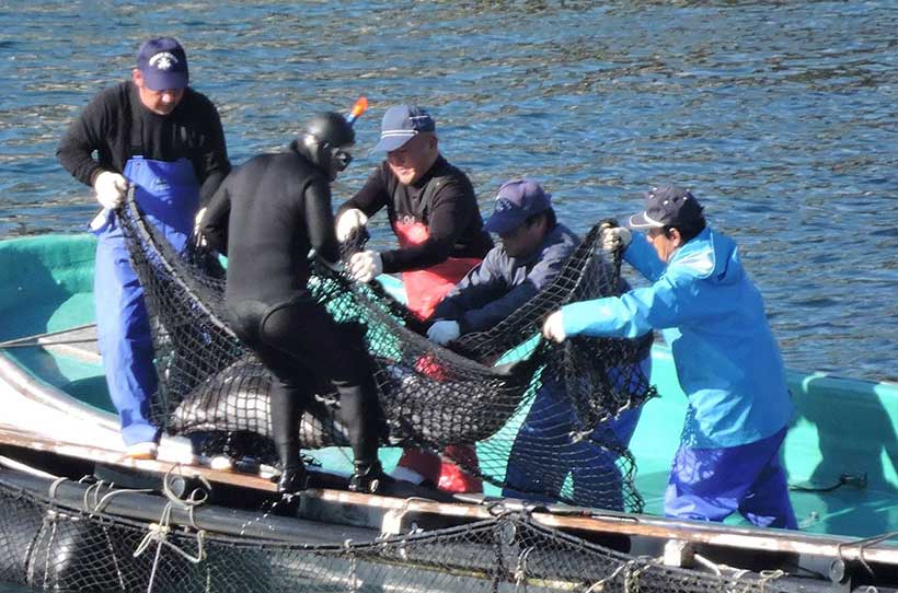 Die vier Delphine erst in Netze eingewickelt und auf die Boote gezogen, entführt von der Killer Mafia in Taiji Japan für ein Leben in einem Zementbecken und dann brutal in die Schwimmkäfige im Hafen geworfen.