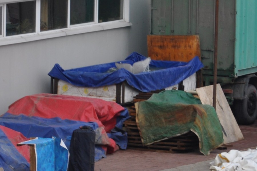Am 3. März wurde entlich angefangen den Pool und die Tribüne aufzubauen. Am Eingang stand ein Wagen der mit Salzsäcken ausgeladen wurde. Die Beluga Wale waren in Behältern wie in Särgen schwimmend in einem Gemisch aus Wasser und ihren eigenen Urin und Kot. Wie unmenschlich grossen physisch und psychischen Stress, was für eine Folter mussten die Beluga Wale wohl erleiden seit der Tortour ihres Fangs und der Reise in den rostigen "Eimmern". KEINE DELFINARIEN, KEIN WAHLFANG !! Alle Regierungen, einschliesslich auch die Schweiz, sind in der Pflicht den Walfang International zu verbieten ,Cetaceans (Wale und Delfine) rechtlich im Gesetzestext als "nicht-menschliche Personen" zu deklarieren.