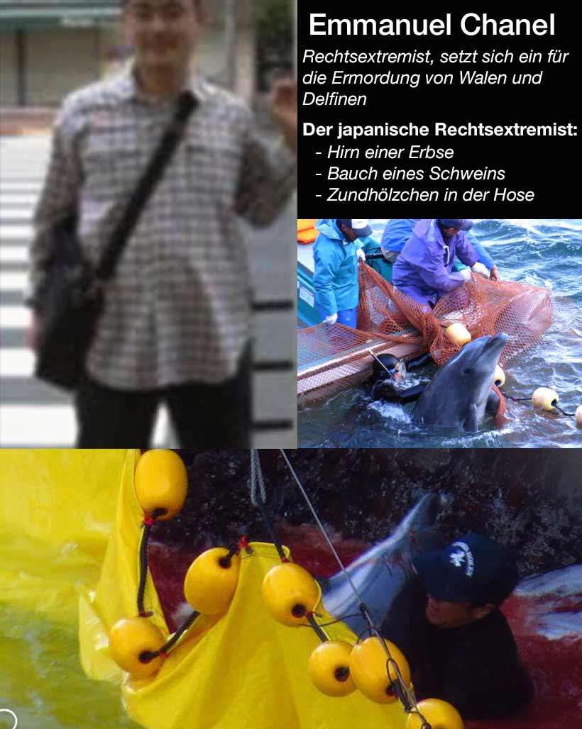 Der japanische Rechtsextremist und Provokateur Emmanuel Chanel sieht sich sich auf Facebook als Gott der Delfinmörder und Walfänger. Emmanuel Chanel arbeitet für Japans Lügen-Forschungsinstitute der icr-whaling. Somit sieht er seine Job in Gefahr.