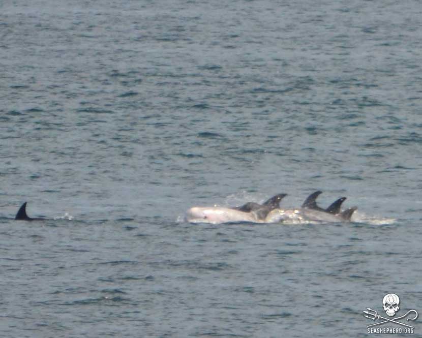 Der kleine Pod wurde heute Morgen um 07.00 am Horizont entdeckt. Die Mörder trieben und jagten die verängstigten Delfine in die Tötungsbucht, verdeckt unter Planen ermordeten sie einen nach dem anderen. Die Delfin-Familie kämpfte mit letzten Atemzügen bis zum Schluss um ihr Leben, sie verloren den Überlebenskampf gegen die Mörder. Die Delfinmörder hämmerten ihnen Eisenstangen in die Wirbelsäule, bis sie mit unvorstellbaren, grauenhaften Schmerzen an Verblutungen verstarben.