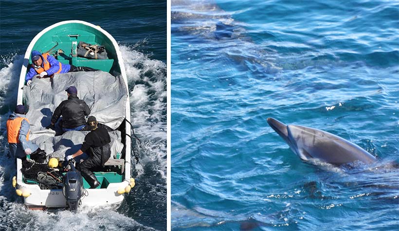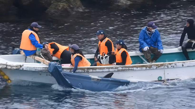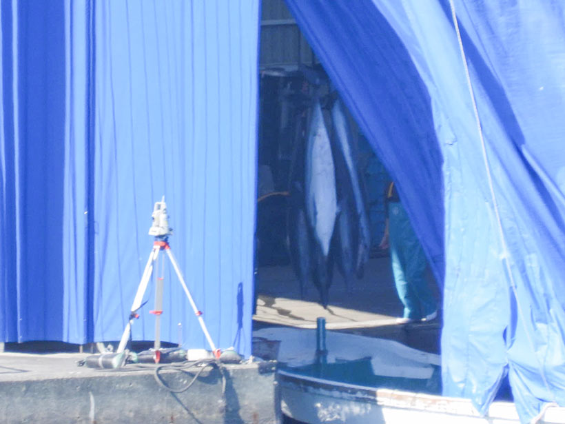 Die Matriarchin wurde an der Schwanzflosse gefesselt hinter der gelben Plane rechts angebunden. Alle Delfine, besonders die Jungen, schwammen immer wieder zu ihr. Sie ist vermutlich nach 9 Stunden Kampf geschwächt ertrunken. Wir wissen, dass japanische Fischer, die in Taiji besonders, Wale ertränken, das ist ihre Tradition.