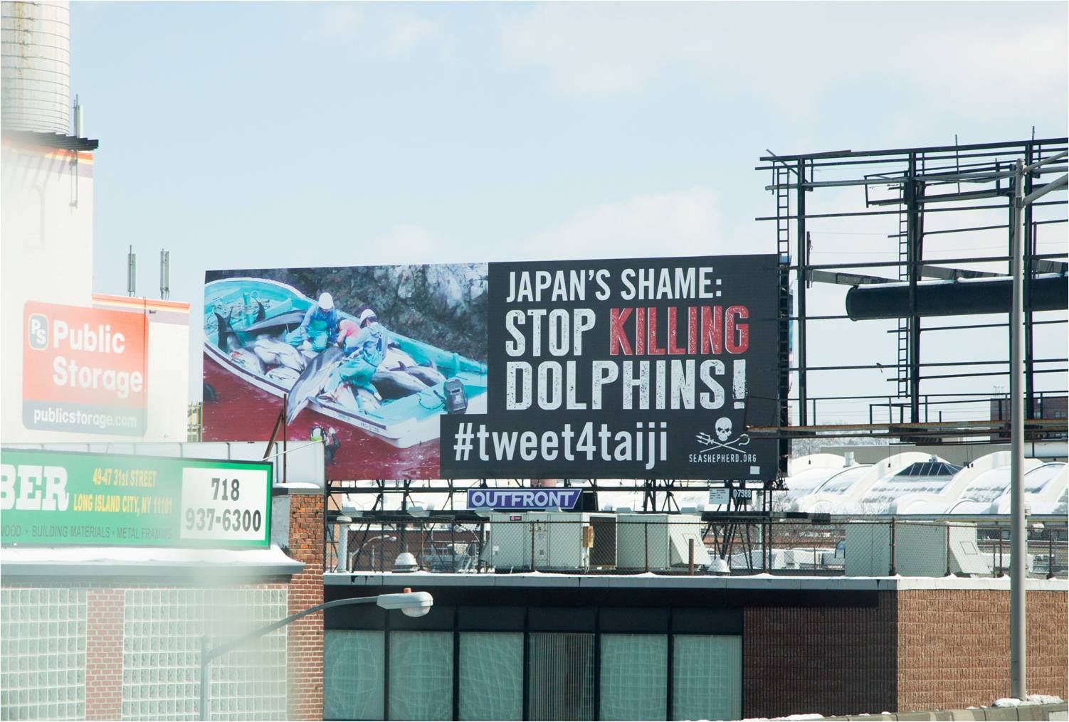 Am 25. Februar wurde durch den Sea Shepherd Fan Marnie McBryde eine grosse Plakatwand in New York City beim Big Apple aufgestellt um den Japanern einer Nachricht ihrer Schande zu senden: "Japans Schande, Stop Delfin Tötung".