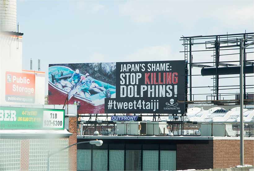 On February 25th, thanks to Sea Shepherd supporter Marnie McBryde, a large billboard in New York City is sending a message of shame to Japan. The billboard erected by OUTRONT Media is on the Long Island Expressway at Van Dam Street facing west and visible to eastbound traffic. Japan’s Shame, Stop Killing Dolphins. Position: NYC Latitude: 40.738222 Longitude: 73.935236 Billboard Photo Credit: Brooke MacDonald. #tweet4Taiji