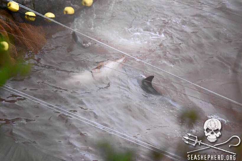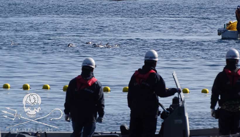 Um ca. 9:30 Uhr Lokalzeit Japan, entdeckte die Tötungsflotte eine Schule Risso‘s Delfine und verschwendete keine Zeit die Familie in ihren endgültige Untergang unter die Mörderplanen in der Tötungsbucht zu schieben...