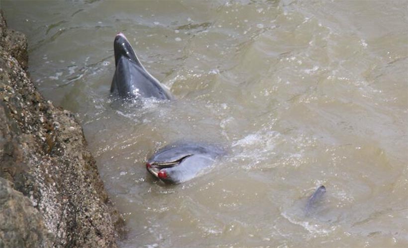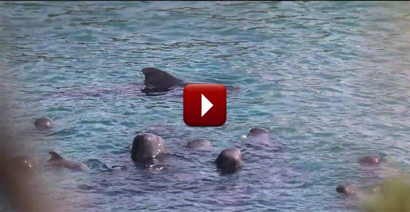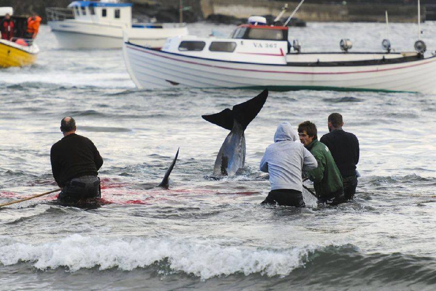 Die erschöpften und verängstigten Delfine und Pilotwale werde über Nacht in der Mörderbucht in Netzen gefangen gehalten.