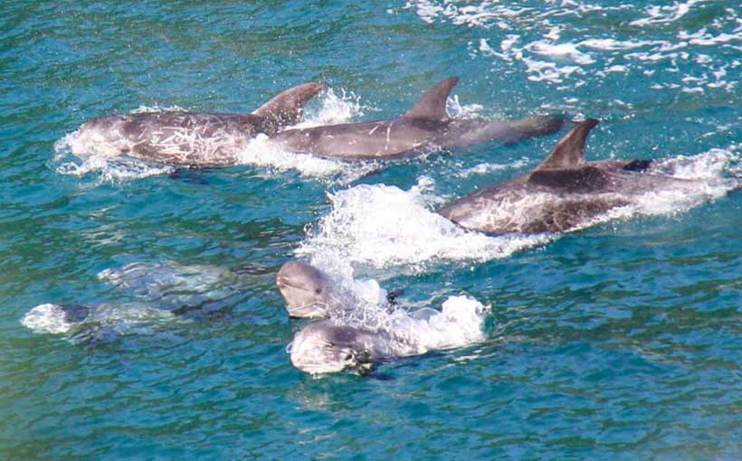 Ungefähr zwei Stunden später trieben sie in einer Hetzjagd eine grosse Delfin Familie von ungefähr hundert Delfinen und eine 20-25 köpfige Pilowal Familie in die Mörderbucht von Taiji.