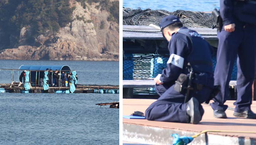 Heute Morgen war ein grosses Polizeiaufkommen bei den Delfin Schwimmgefängnissen im Hafen von Taiji.