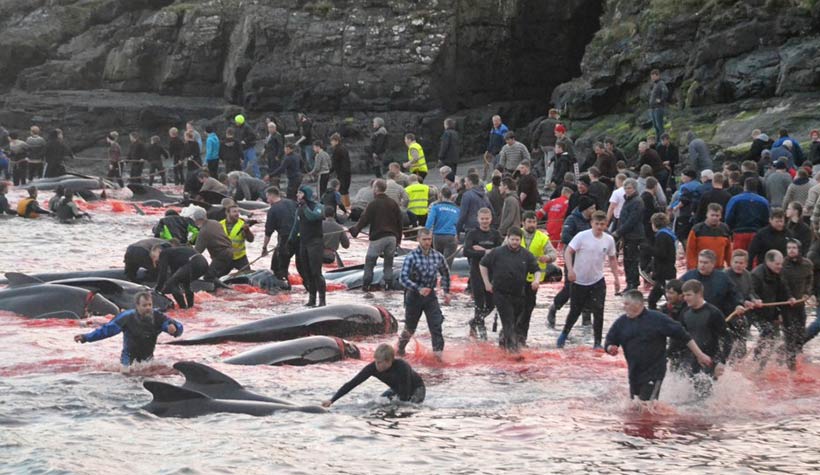 Am Sonntag 21. Mai 2017, 19 Uhr färöische Zeit, starteten südlich von Mykines gegen dreissig Färöer Boote und Schiffe ihre barbarische „Blut-Lust Treibjagd“, sie trieben eine Herde Pilotwale in die Bucht von Bøur.