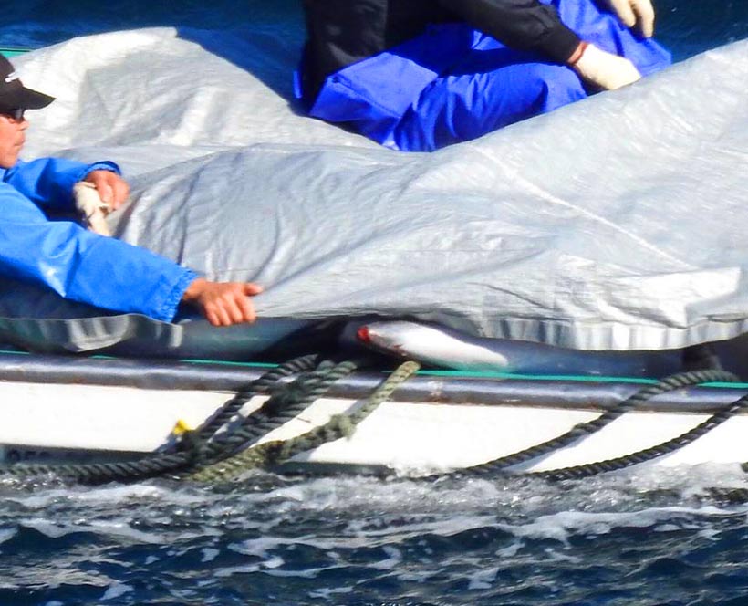 Taiji 19. 12. 2017: Heute Morgen fand wieder eine Pest-Control- Verwüstung in der Bucht von Taiji statt, die sechste Familie Breitschnabeldelfine in dieser Saison wurde auseinander gerissen und gewaltsam zerstört...