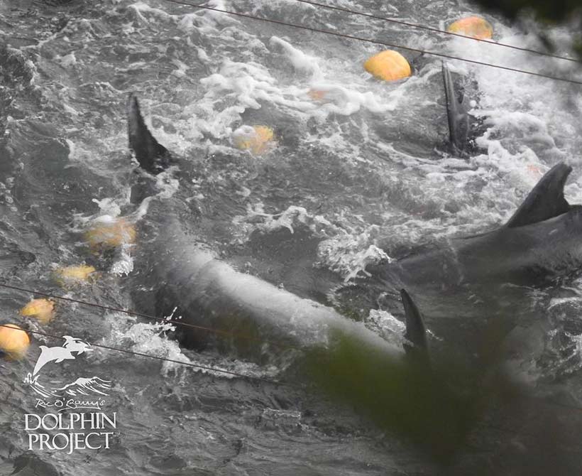 Ric O'Barrys Dolphin Project filmte und veröffentlichte die unglaublich Grausamkeit die der Streifendelfin Familie am 8. November 2018 angetan wurde.