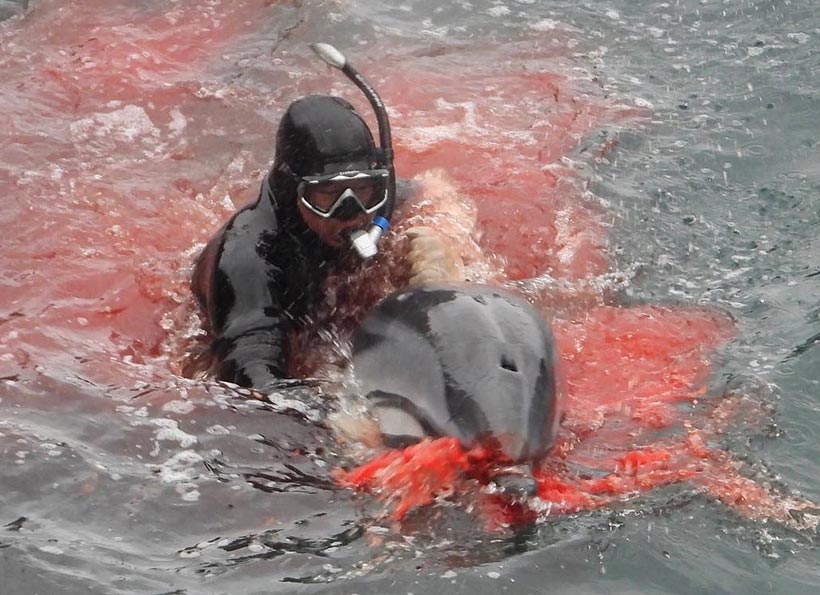 Nach den unmenschlichen Delfin-Massakern von vorgestern und gestern fand heute am dritten Tag in Folge ein weitaus grösseres statt. Streifendelfine werden jedes Mal wenn sie in die Bucht terrorisiert werden besonders brutal misshandelt...