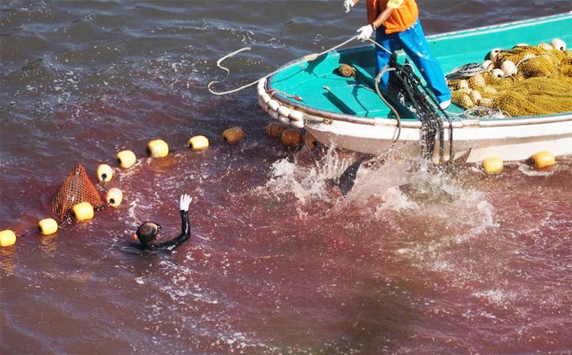 Der schreckliche Tag von gestern hat sich heute wiederholt, wieder begannen die ersten Jagdschiffe nach zwei Stunden vergebener Suche nach Delfinen in den Hafen zurückzukehren. Plötzlich, etwa 500 Meter vom Hafen entfernt, drehten sie abrupt um und rasten mit hoher Geschwindigkeit...