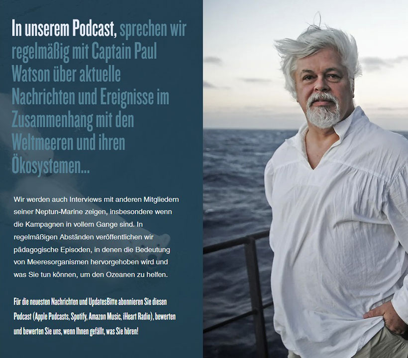 Mit diesem Link gelangen Sie direkt zur Webseite und zum Podcast von Paul Watson Fundation. Oder wenn Sie möchten alle Podcast von Captain Paul Watson auf Apple Podcasts Preview, für alle frei zugänglich und ohne sich einloggen zu müssen