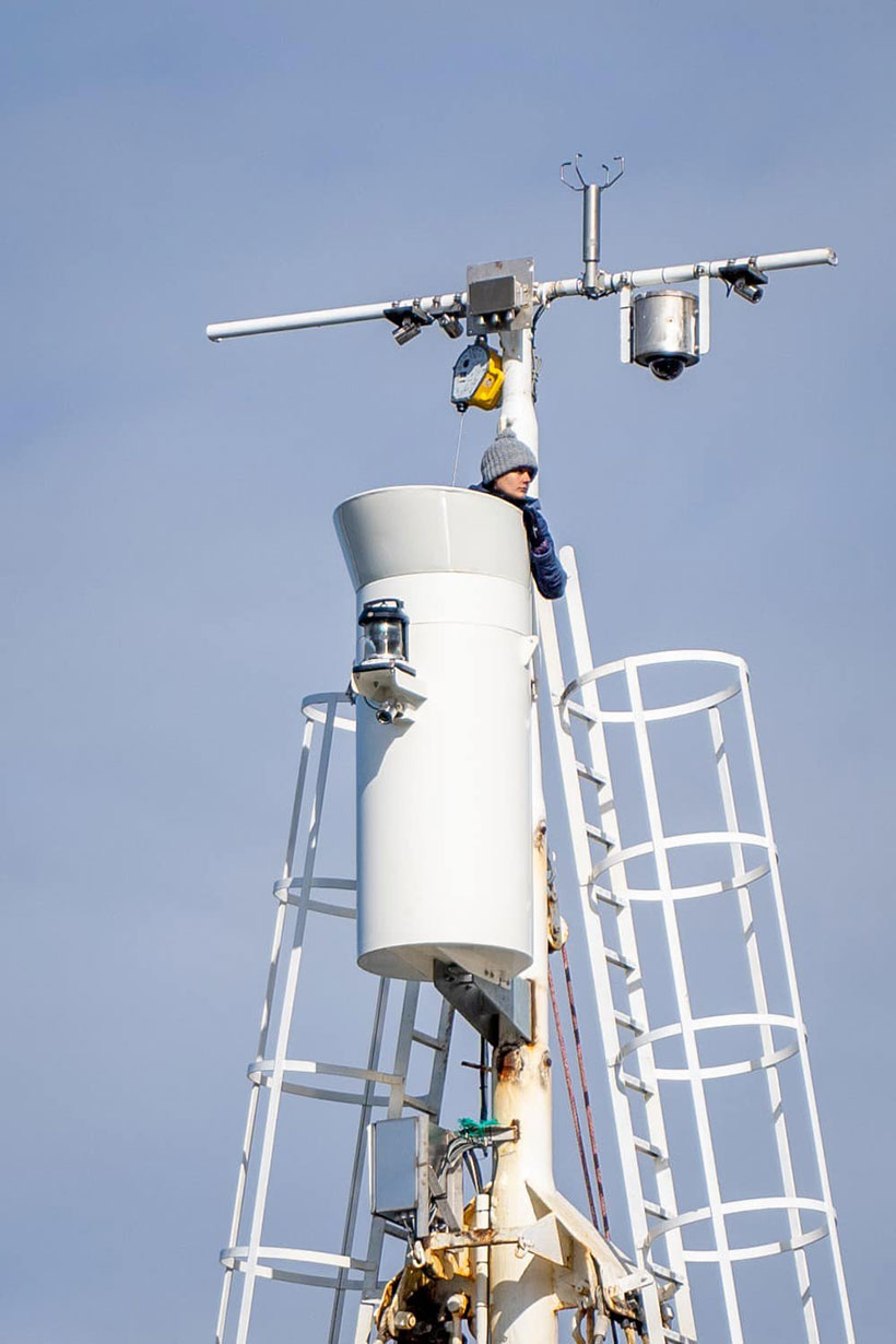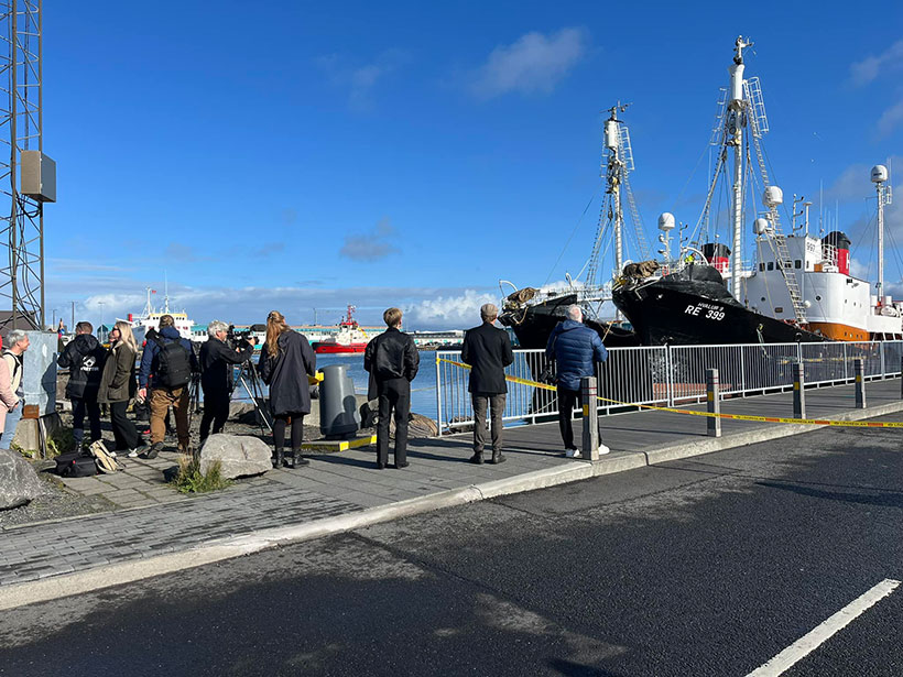 Heute Morgen sahen wir, wie zwei Aktivisten den Mast eines Hvalur-HF-Harpunenschiffs erklommen, das an dem Morgen in See stechen sollte, um majestätische Finnwale zu töten. "Loftsson, Vorsicht! – Aktivisten sind unermüdlich in ihrer Entschlossenheit, Sie zum Stoppen zu bringen!"